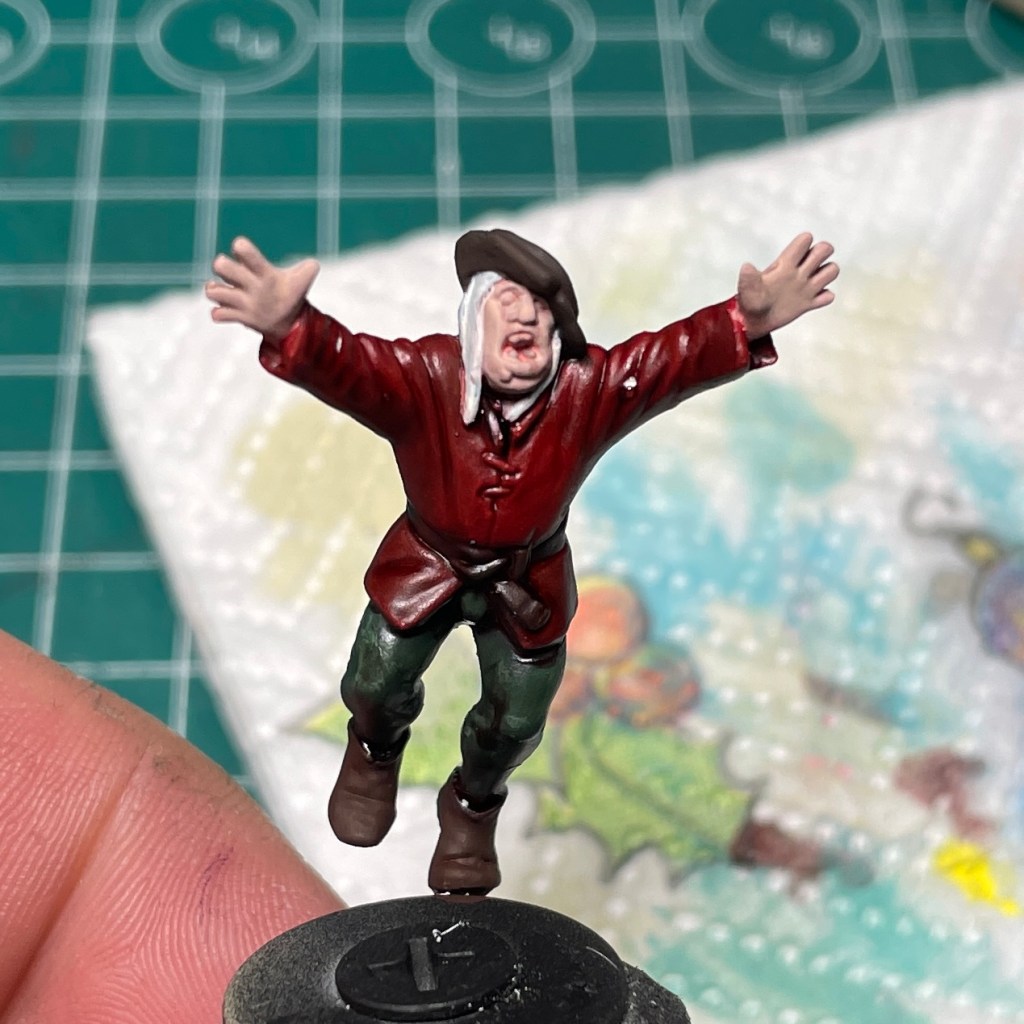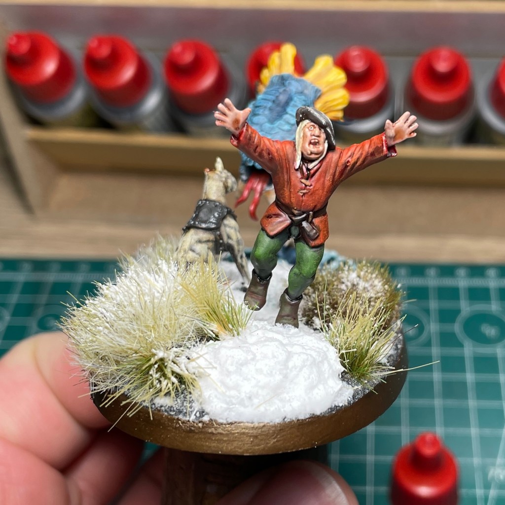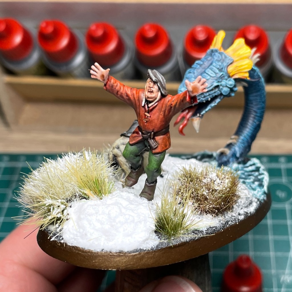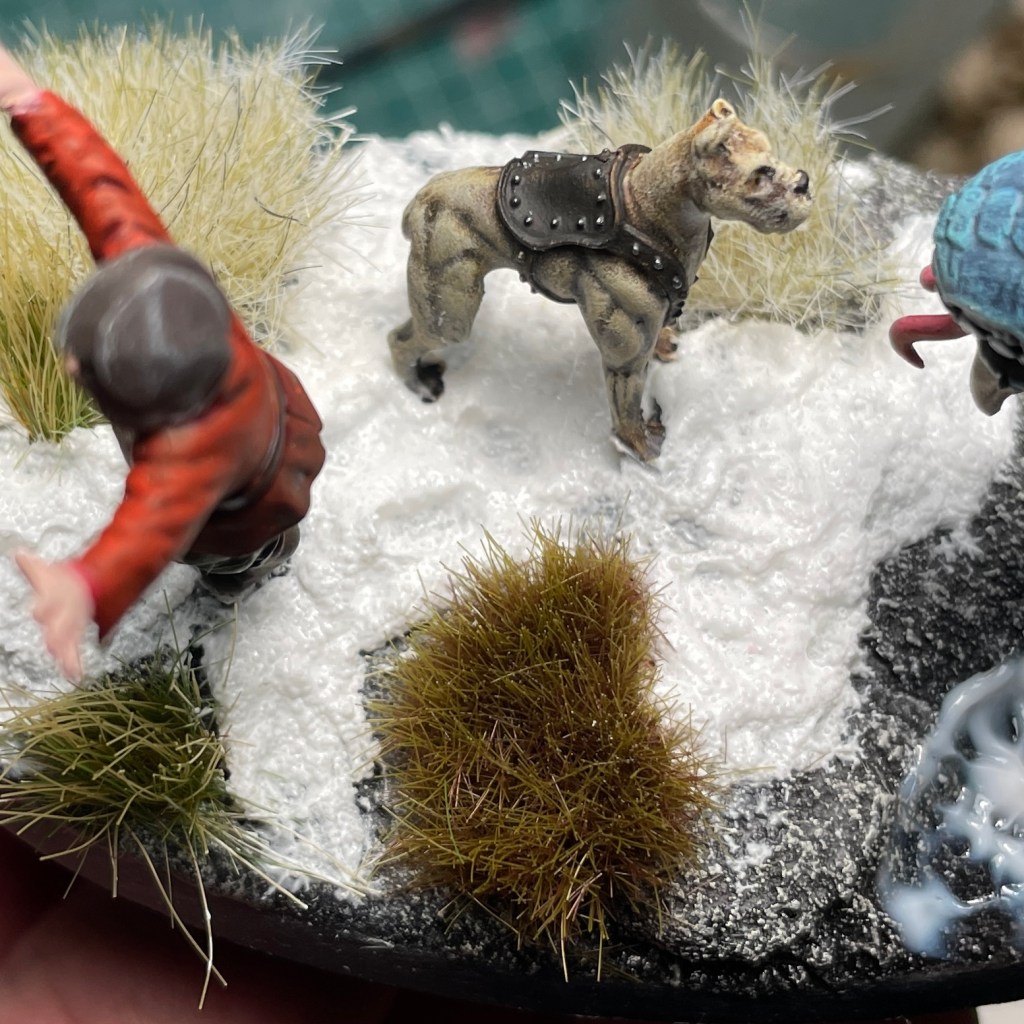 Uciekający mężczyzna nie sprawiał żadnych problemów, za to w przypadku psa jego rany bitewne i krew na śniegu wynikają z tego, że po prostu ta figurka dojechała już do mnie z ukruszonym uchem, stwierdziłem jednak, że skoro psiak ma bohatersko bronić swojego pana przed morskim stworem nie powinien wyjść z tego całkiem bez szwanku.