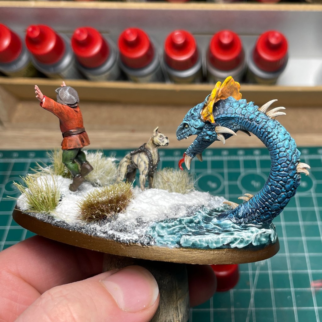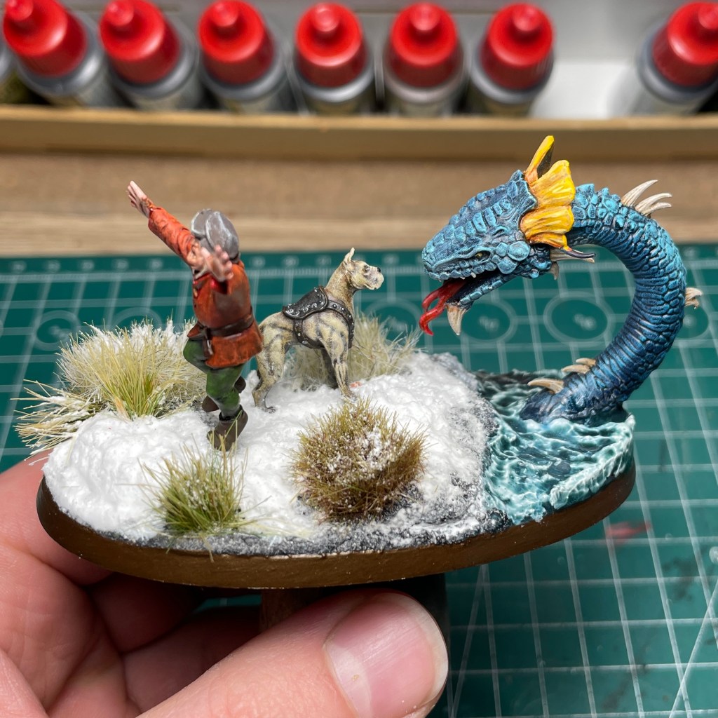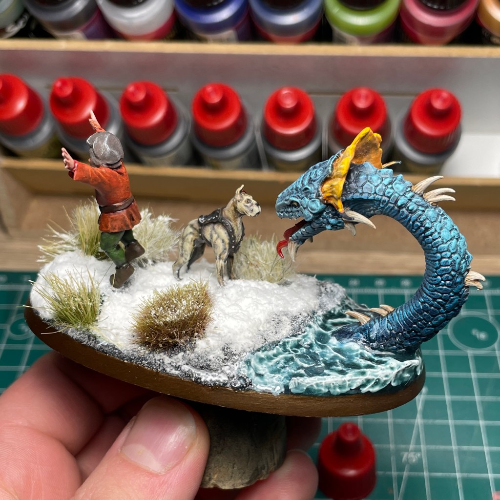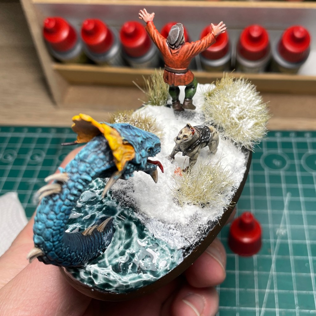 Wyzwaniem logistycznym było zagospodarowanie przestrzeni na wybranej przeze mnie podstawce, nie chciałem jej zbytnio zaśmiecać ozdobnikami, ale też nie mogłem zrobić zbyt łysej. Wydaje mi się, że udało się to jakoś wypośrodkować. Przy okazji robienia tej pracy po raz drugi w życiu robiłem śnieg na podstawce, jestem z niego całkiem zadowolony (udało się nawet zrobić odciski butów w śniegu!), podobnie jak z wody, gdzie też dopiero zaczynam się uczyć obchodzenia z żywicą i efektami wody.