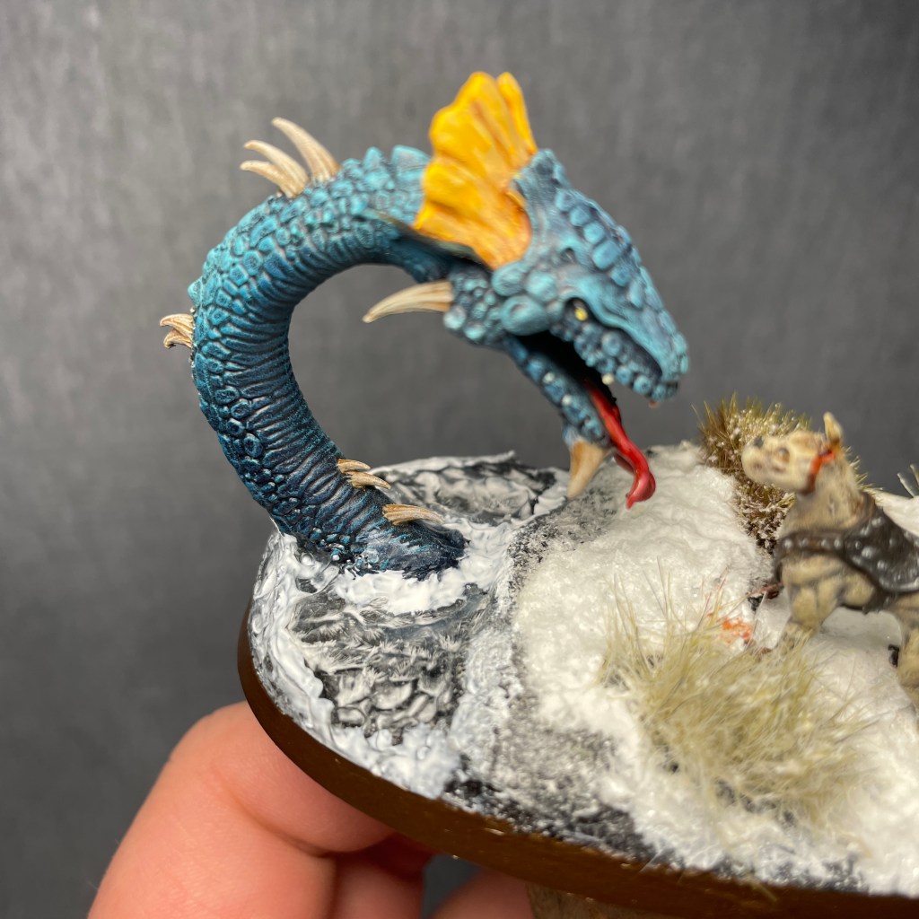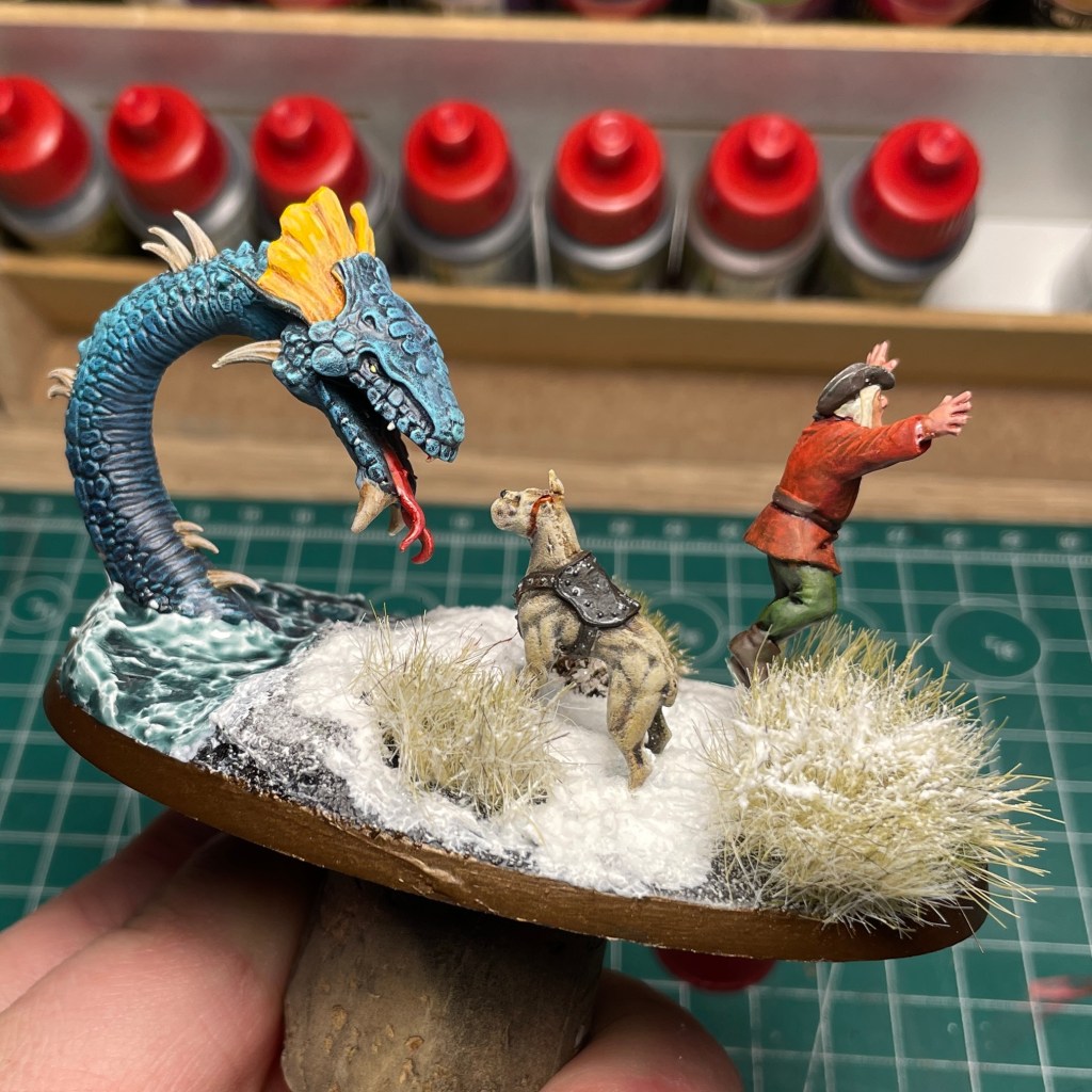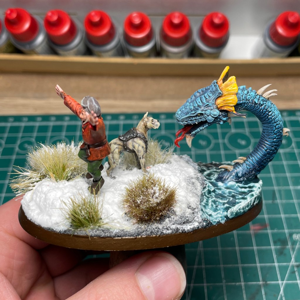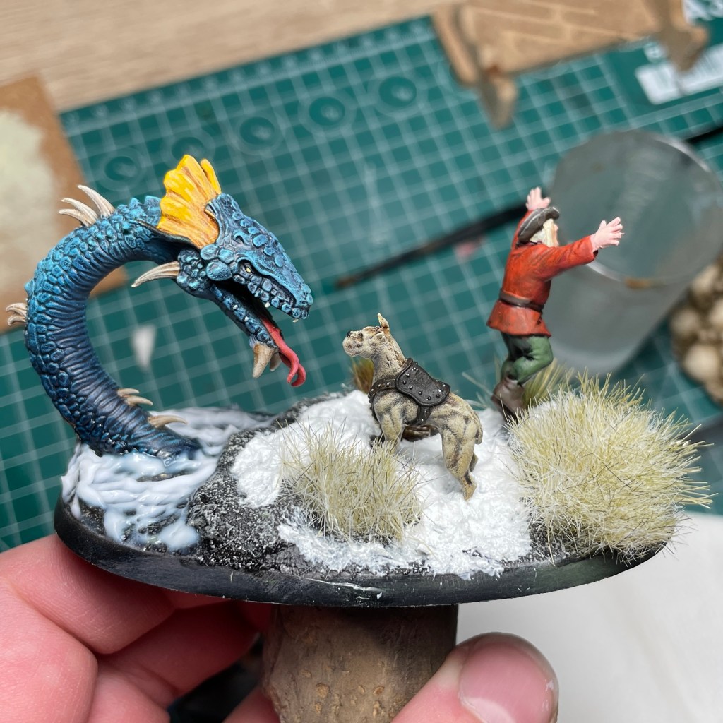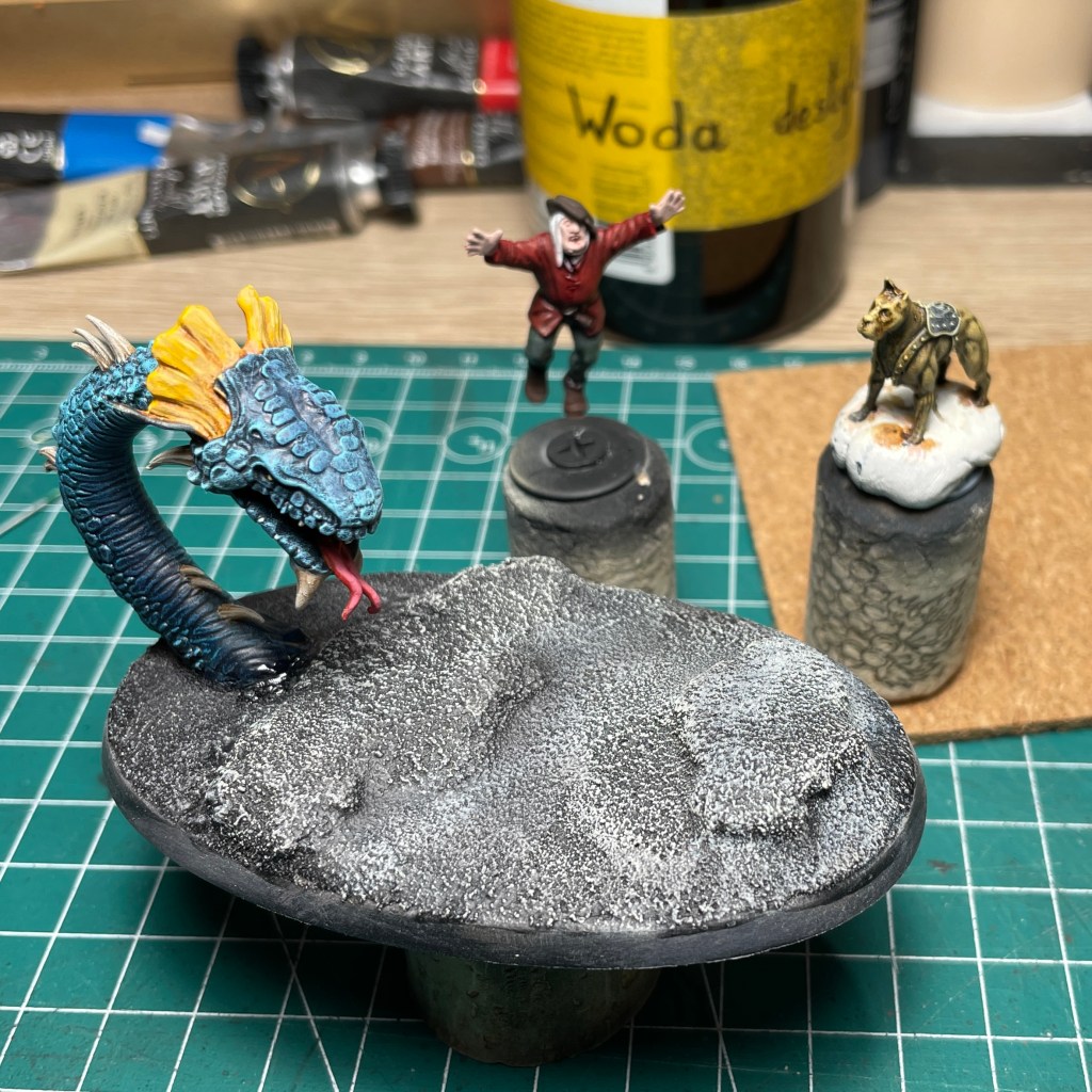 Wyzwaniem logistycznym było zagospodarowanie przestrzeni na wybranej przeze mnie podstawce, nie chciałem jej zbytnio zaśmiecać ozdobnikami, ale też nie mogłem zrobić zbyt łysej. Wydaje mi się, że udało się to jakoś wypośrodkować. Przy okazji robienia tej pracy po raz drugi w życiu robiłem śnieg na podstawce, jestem z niego całkiem zadowolony (udało się nawet zrobić odciski butów w śniegu!), podobnie jak z wody, gdzie też dopiero zaczynam się uczyć obchodzenia z żywicą i efektami wody.