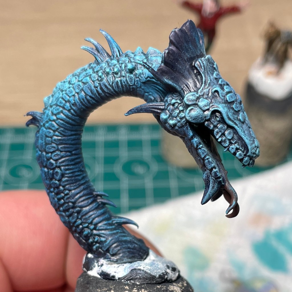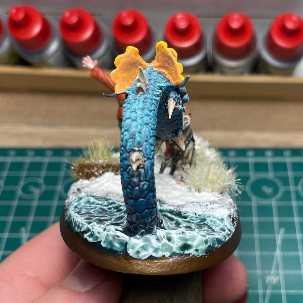 Z wodą było znacznie więcej zabawy, nie chciała mi wyjść, jakbym nie kombinował to coś mi nie pasowało. Na przemian dokładałem Transparent Water i Water Foam od Vallejo, w międzyczasie wjechał jeszcze Liquid Frost od GSW, cały czas wydawało mi się to mdłe. Z pomocą po raz kolejny przyszły washe od AP, zmieszałem ze sobą niebieski i zielony, a następnie szczodrze wysmarowałem tą mieszanką wodę i to chyba był strzał w dziesiątkę.