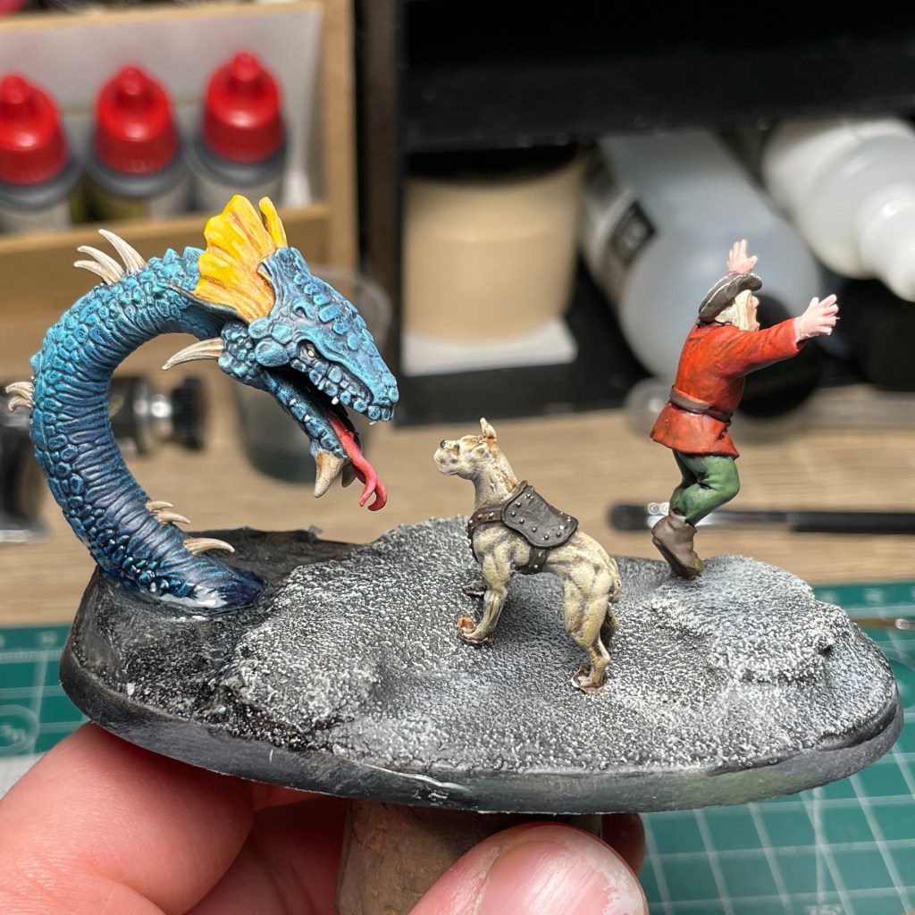 Długi czas zastanawiałem się jaką figurkę wybrać do tego projektu, chciałem zrobić coś fajnego z użyciem psiaka obronnego, ale kusił mnie też chyba najsłynniejszy uciekający mieszczanin od GW. Ratunek w podjęciu decyzji przyniosło mi pudło z bitsami i znajdujący się w nim łeb hydry, scenka z udziałem całej trójki pojawiła się w mojej głowie momentalnie.